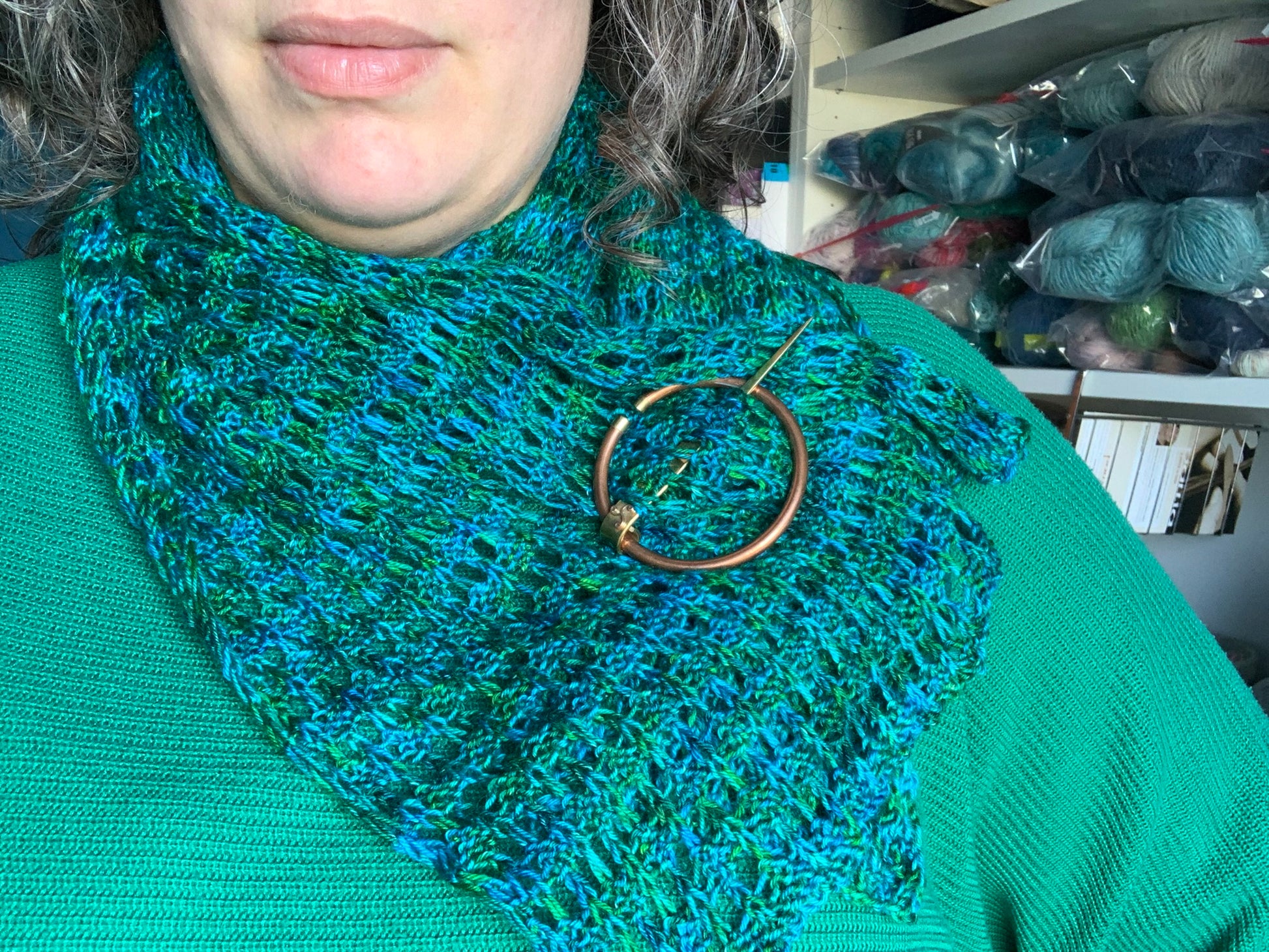 Now that it’s completed, I love draping it around my shoulders, most often held together with a shawl pin.